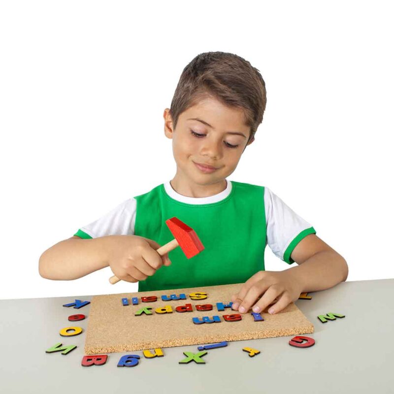 همچنین تعدادی میخ نیز در بسته بازی وجود دارد. باید از فرزند خود بخواهید که حروف انگلیسی را با استفاده از میخ و چکش روی صفحه چوب پنبهای بکوبد و به این ترتیب کلمات انگلیسی مختلف را ایجاد کند.